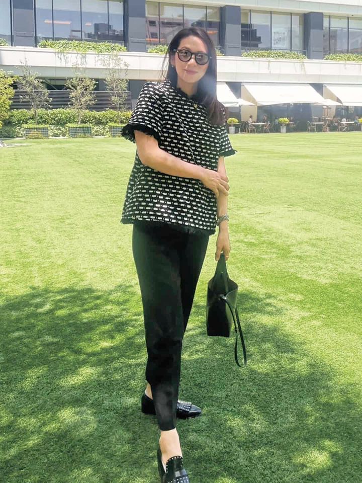 黒は、シルエットや素材の違いが際立ちやすい色なので、異素材を組み合わせて奥行きを出すようにしています。子どもの学校関係の用事はもちろん、友人とのゆったりしたホテルランチなど、きちんと感が欲しい場面でも、ほぼ黒なら品よくまとまり、安心感があります。