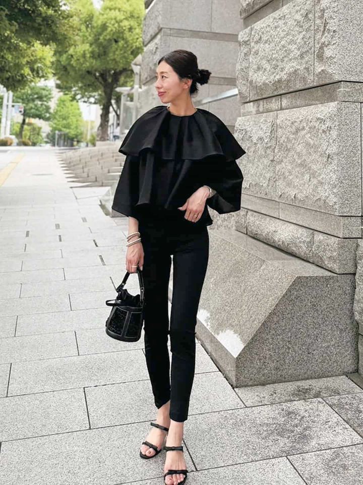 フリルブラウスやリボンサンダルも、ブラックなら甘くなりすぎず、大人っぽく取り入れられるのが嬉しいポイント。トップスにボリュームがある分、パンツはタイトに、ヘアはまとめて、涼しげな印象に仕上げました。