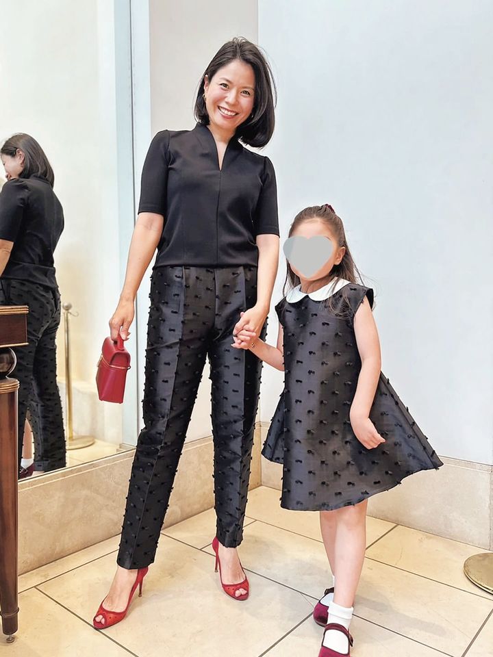 黒はフォーマルな場にも対応できて、汚れも目立ちにくい。元気な娘との時間にも安心して着られる、東京ママにとっての最強カラーです。娘の送迎は自転車移動が基本なので、動きやすいパンツ一択。この日のアンプレガントのパンツは、娘のワンピースとお揃いのリボン生地なのもお気に入りポイント。さりげないリンクコーデを楽しんでいます。
