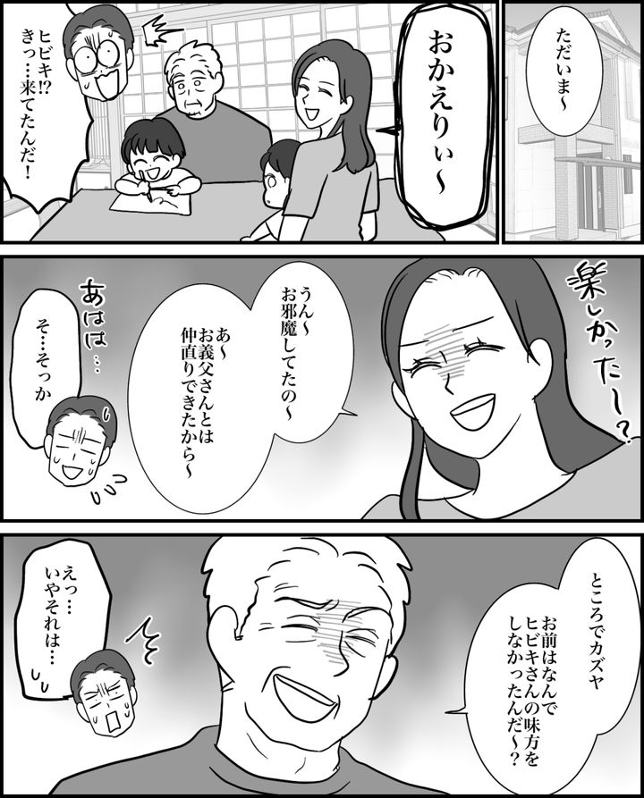 義父とともに義実家でくつろいでいる私や子どもたちをみて、カズヤは驚いたようでした。義父は私のことを思ってカズヤを叱ってくれます。「奥さんが困っているのに、情けない! だいたいお前は、普段からヒビキさんに甘えすぎなんだ」