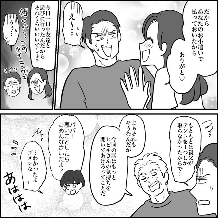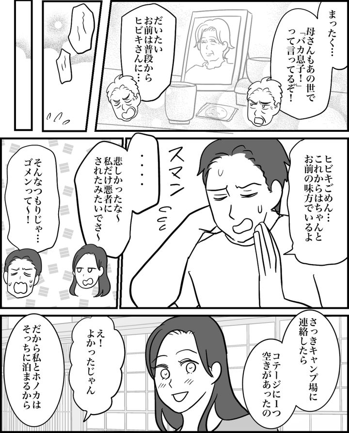 私はヒビキ。息子ユウマ(3歳)、娘ホノカ(1歳)、そして旦那カズヤの4人家族です。義父がお盆休みに予約を取ったキャンプ場では、狭いテントで義父と一緒に寝泊まりしなくてはいけません。ホノカの授乳もあるのにそれは無理です。しかしカズヤからはワガママだと責められて言い争いに……。怒って追い出すとカズヤは義実家に泊まったようです。私は次の日、義父と話をしました。きちんと感謝を伝え、丁寧に理解を求めると義父は分かってくれて……。