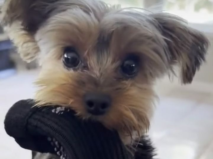 「これ気に入った!」飼い主さんの靴下をくわえて自慢するヨークシャーテリア