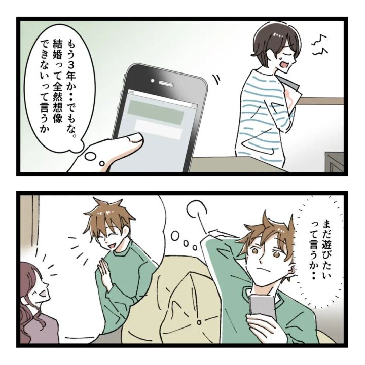 もう3年か。でもな。決断できずにいたのは、別にマイと結婚したくないとか、別れたいってわけじゃなかった。結婚というものが全然想像できなかったというか、まだ遊びたいというか。