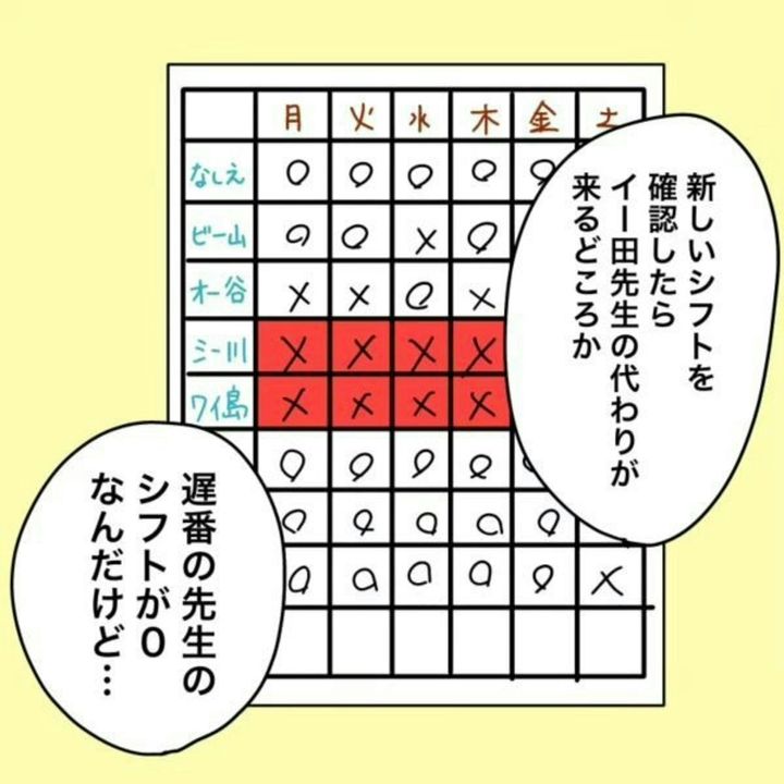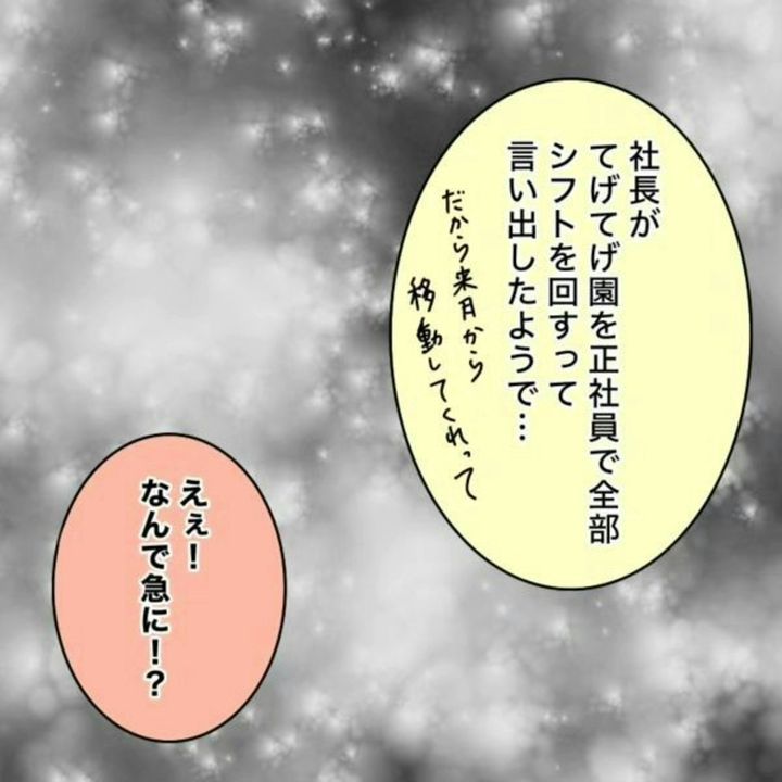 なしえマミ~〚エッセイ漫画&育児漫画〛(@nasie1025)さんが以前、保育士として勤めていた保育園は、助成金目的のワンマン社長が自身の営利目的だけを考え、従業員のことをコマのように使うひどい職場環境でした。保育士の現状や本来の職場環境はどうあるべきか、改めて考えさせられるお話です。職場のシフト調整は難しいですよね。今は人手不足なこともあり、新しく人を雇いたくても人がいない…ということもあります。しかし職場の利益を上げるだけのために人員を減らされたら、仕事のクオリティもモチベーションも下がっていいことはないはずですが…。