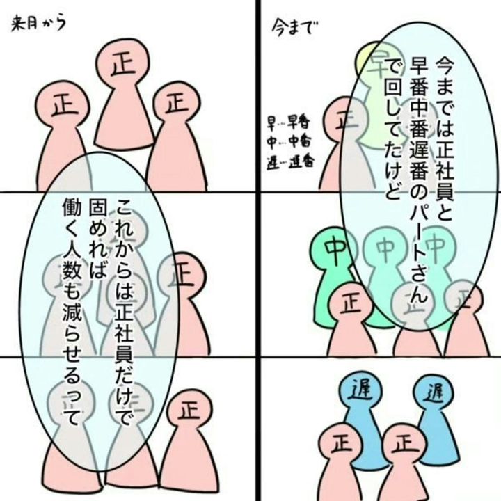 適正な人員配置のためのシフト調整ではなく、ただ経営のために従業員をコマのように扱うやり方は人心が離れていくだけですよね。現場の状況も知らず、現場の声も聴かず経営を進めていくと、その先に残っているのは誰もいない現場になるような気が…。