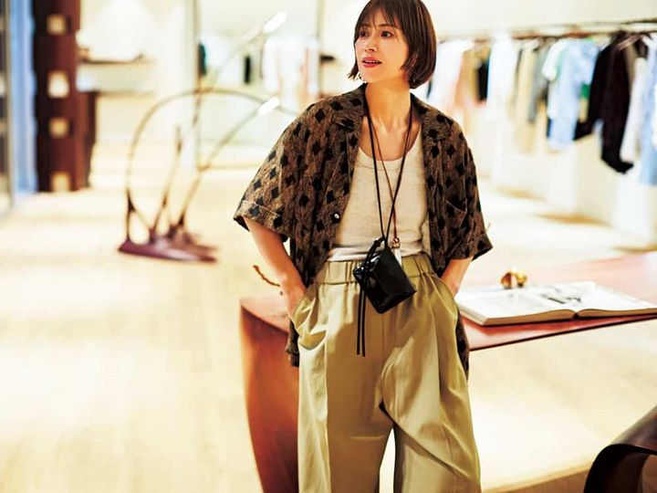 エッジを利かせベーシックを底上げしてくれるから着るだけでオシャレが叶います。ショップで爆売れ中のネックレスポーチはひろ子さんもお買い上げ。W168,000シューホーン(靴べら)ネックレスW98,000タンクトップW88,000シャツW268,000チノワイドパンツW328,000