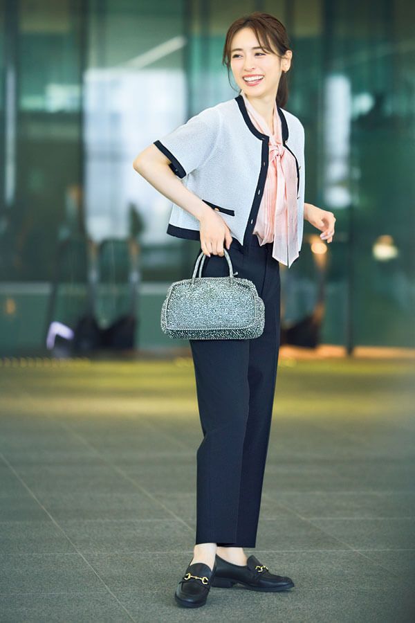 カーディガン¥16,500、ブラウス¥17,600/ともにジャスグリッティー パンツ¥3,990/UNIQLO イヤリング¥53,900/ヴァンドーム青山(ヴァンドーム青山本店) バッグ¥89,100/アンテプリマ/ワイヤーバッグ(アンテプリマジャパン) 靴¥23,980/タラントンby ダイアナ(ダイアナ 銀座本店)