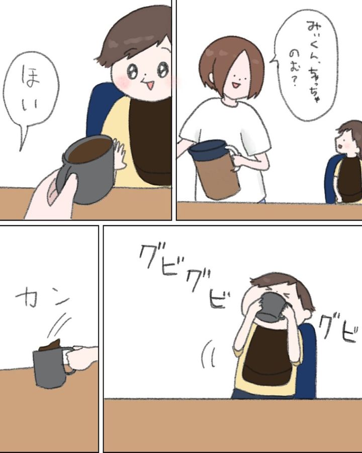 3歳の男の子みぃくんのお母ちゃんであるねむりひつじさんから、お茶を飲むときのみぃくんのお話です。