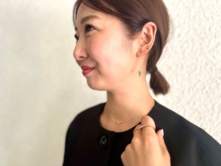 「身近な人や物をイメージして、日常にジュエリーを身につけていただけるデザインを考えています」という佐々木さん。いずれもK18YG(18金のイエローゴールド)なので、フォーマルシーンにも。ピアスはワイングラスのモチーフ、ネックレスはヘビのモチーフ。会う人や出かける場所に合わせて選ぶのも楽しそう!