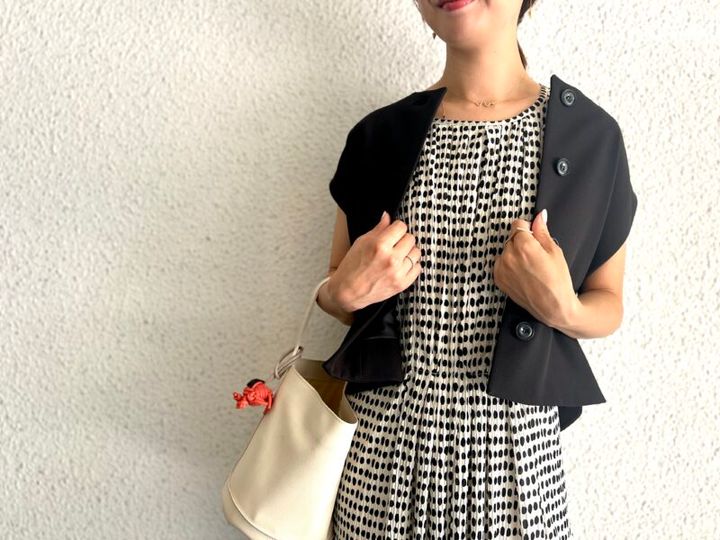 軽くてコンパクトな黒のジャケットは、モデルの上野朋子さんのブランド「Sync(シンク)」。「上質、上品さ、モード感を兼ね備えていてとても重宝なんです」と佐々木さん。前ボタンを開けて着れば、また違った雰囲気に。