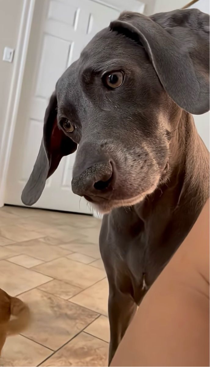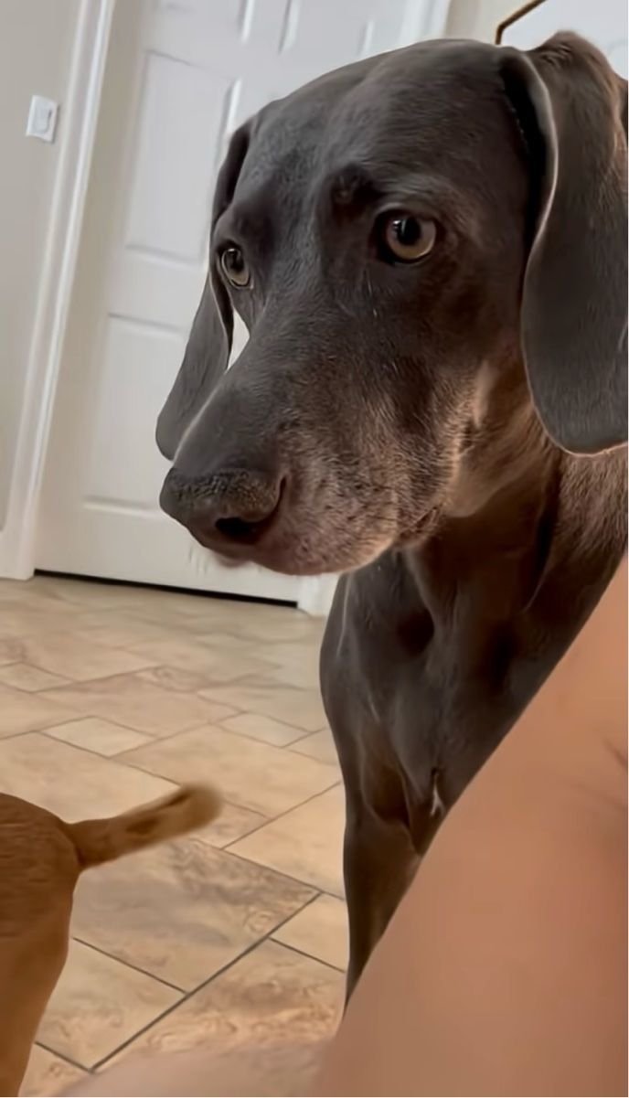 3. 「なんて言ってるんだろう?」ふにゃふにゃ声を出す赤ちゃんをそっと見守るワイマラナー【アメリカ・動画】