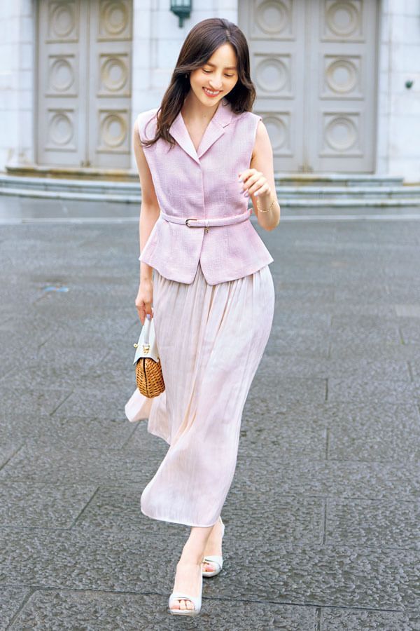 スカートもピンクトーンで繋いで女性らしい雰囲気に。ジレ×落ち感スカートが作る縦ラインでスタイルアップも叶えて。