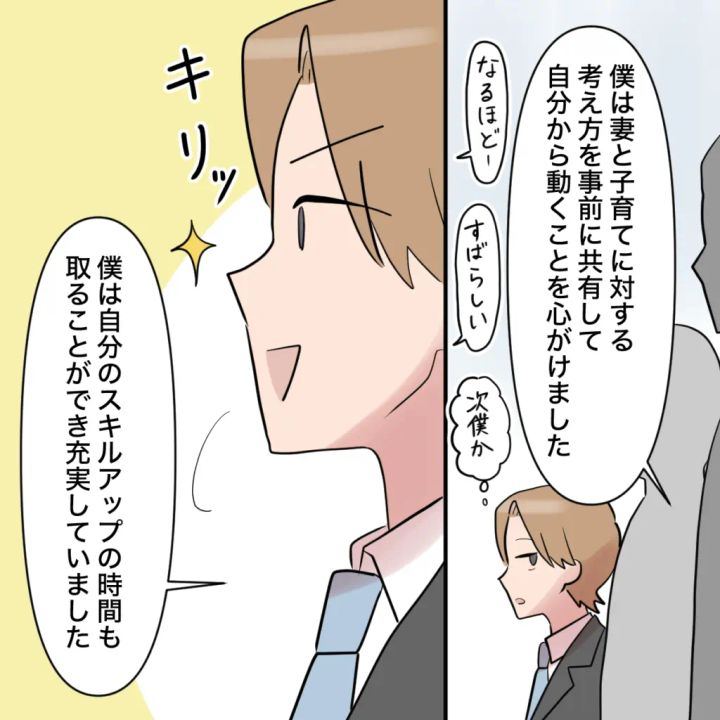 他にも「僕は妻と子育てに対する考え方を事前に共有して自分から動くことを心掛けました。」と発言した社員に対して「なるほど」「すばらしい」などという声が聞こえてきました。そしていよいよオサムさんの番になると、「僕は自分のスキルアップの時間も取ることができ充実していました。」とキリッとした顔で発言しました。