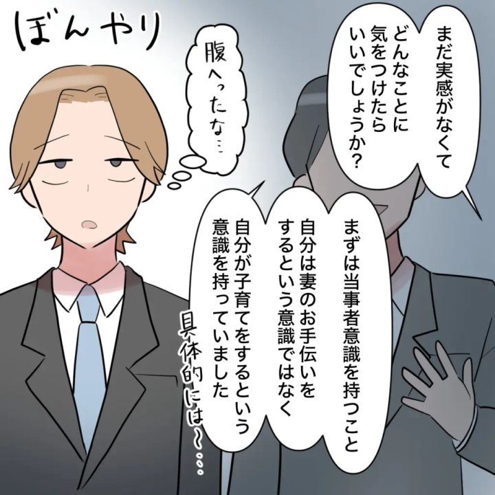 後輩社員から、育休中に気をつける事を尋ねられ、「まずは当事者意識を持つこと、自分は妻のお手伝いをするという意識ではなく、自分が子育てをするという意識を持っていました。」と的確にアドバイスする他の育休取得社員のやりとりがある中、オサムさんはお腹が空いたとボンヤリするだけでした。