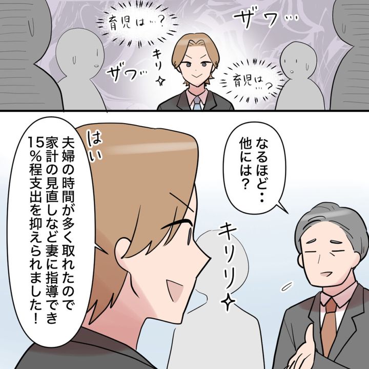 ミーティングのテーマとズレたオサムさんの回答に「育児は?」と会議室はザワつきますが、オサムさんは全く気付かずドヤ顔です。「なるほど・・・他には?」と言った上司にも「夫婦の時間が取れたので家計の見直しなど妻に指導でき、15%ほど支出を抑えられました!」と自信たっぷりに答えました。