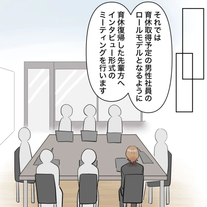 会社では、これから育休を取得する予定の男性社員と、育休を終えた男性社員を集めてミーティングが開かれました。