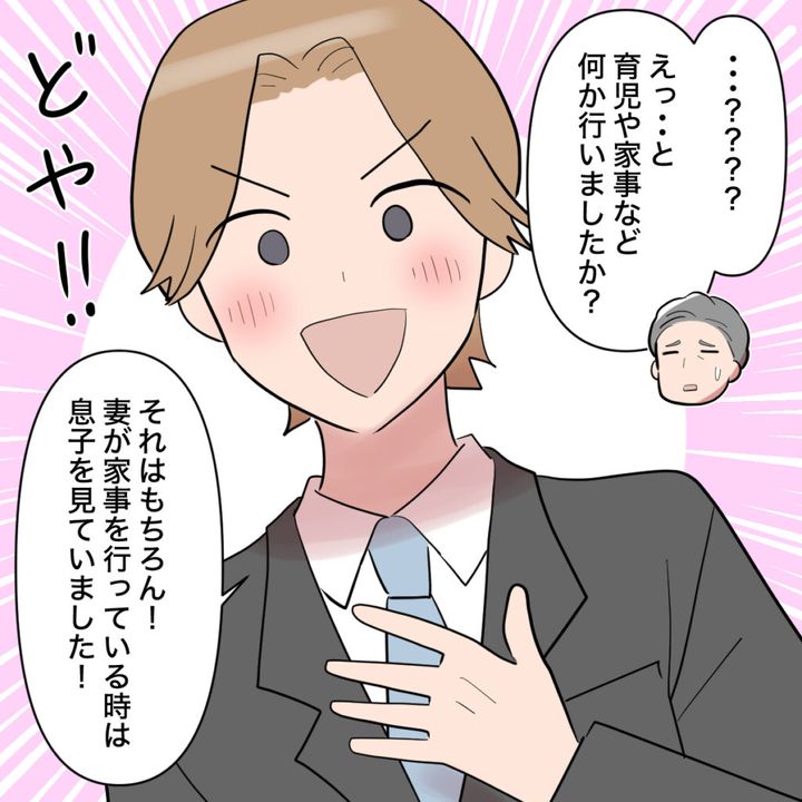 何を言っているのか分からない、といった様子の上司が「えっ・・・と、育児や家事など何か行いましたか?」と誘導しても、「それはもちろん!妻が家事を行っている時は息子を見ていました!」とドヤ顔で答えました。