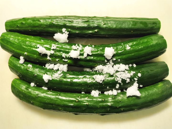 1. きゅうりの両端を切り落とし、塩をしっかりと振って板ずりします。