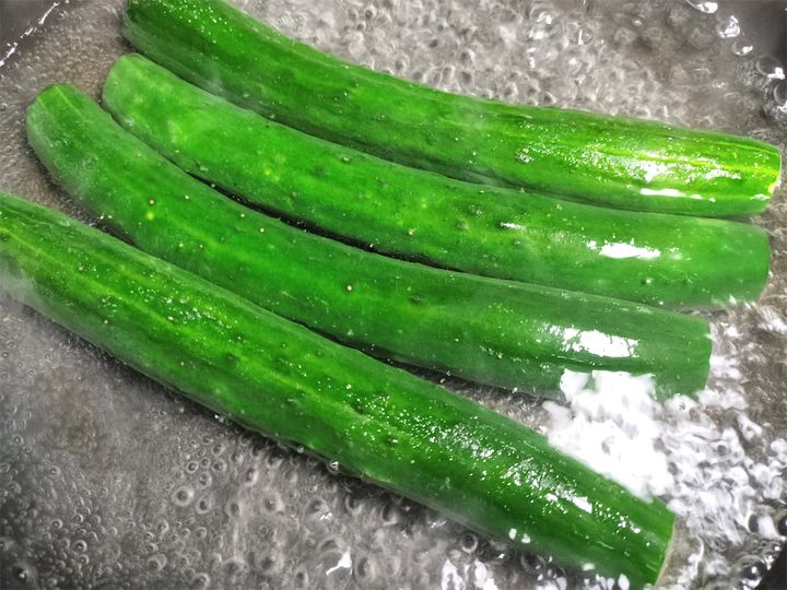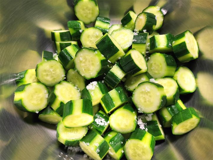 2. きゅうりが入る大きさの鍋かフライパンにお湯(分量外)を沸かし、お湯の2%の塩を加えてきゅうりを30秒~1分茹でて、氷水で冷やします。
