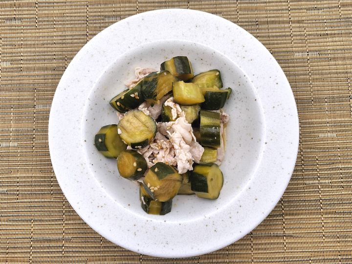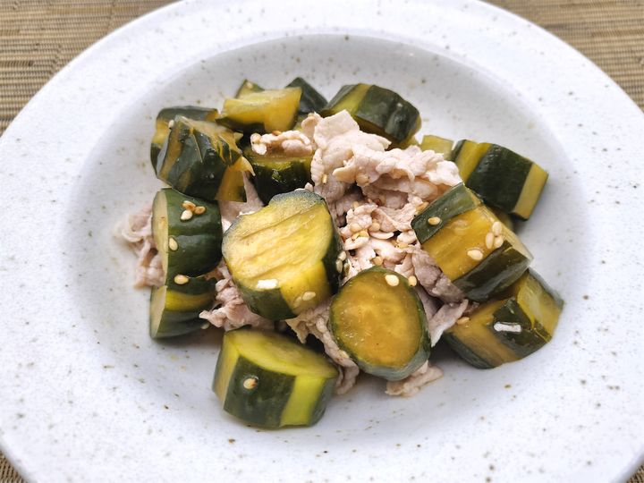 きゅうりを適量取り出して軽く叩いて、漬け汁ごとボウルに入れ、豚バラ肉(しゃぶしゃぶ用)を100g程度茹でたものを、和えて盛りつけました。
