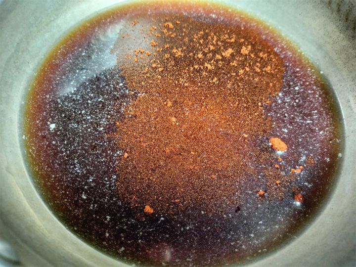 4. 鍋にチキンブイヨン、しょうゆ、酢、蜂蜜、一味唐辛子を入れて火にかけます。