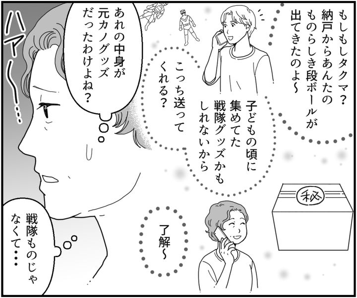 私(義母)は、夫との2人暮らし。娘のモエと息子のタクマはそれぞれ家庭を持って子どももいます。近所に住むモエは夫婦共働きのため、手助けできればと話し合ってわが家で二世帯同居をすることになりました。タクマは車で2時間ほどの場所で、お嫁さんのヒナちゃんと2歳のアオトくんと暮らしています。家をリフォームするにあたって不要な品々を処分するなか、私はタクマの物らしき段ボールを本人宛てに送りました。すると……?