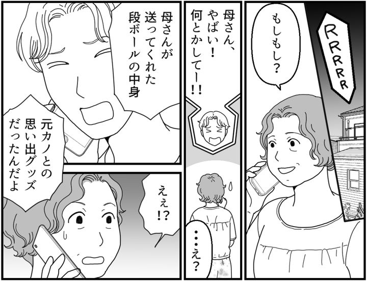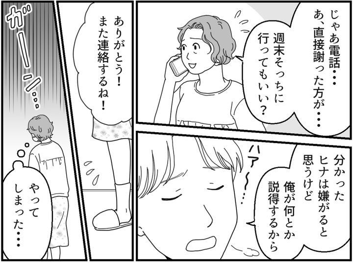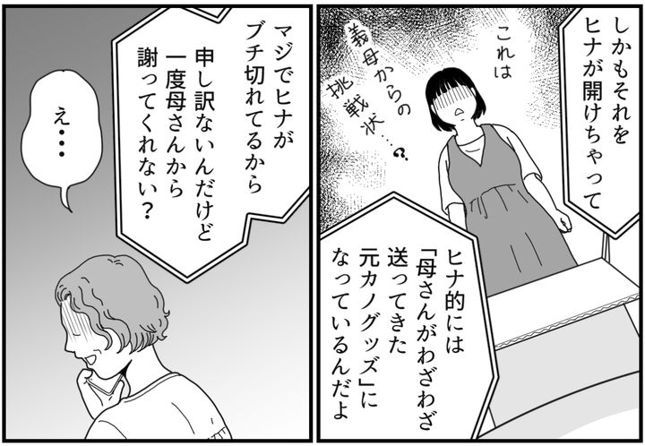 電話越しに、タクマが相当動揺しているのが伝わってきました。それくらいヒナちゃんが怒っているということなのでしょう。当たり前です。息子の元カノグッズをわざわざ自宅に送ってくる義母なんて、最悪です。元カノの物を大事にしまっておくタクマもどうなのとツッコみたいところですが、今はそれを言っても仕方ありません。