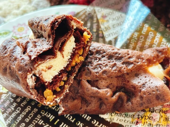 半分に割ってみると…。アーモンドクランチが詰まってます!まずはクリームだけをパクリ!マスカルポーネチーズがホイップのような軽やかさ!早速ティラミスの味わいが口の中いっぱいに広がります~。コーヒーやココアの味わいがするクレープ生地は、ほどよいモチモチ感でとっても滑らかです。