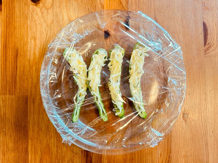 この後、ピーマンの肉詰めの感覚でフライパンで焼きたくなりましたが、ここからレンジへGO♪