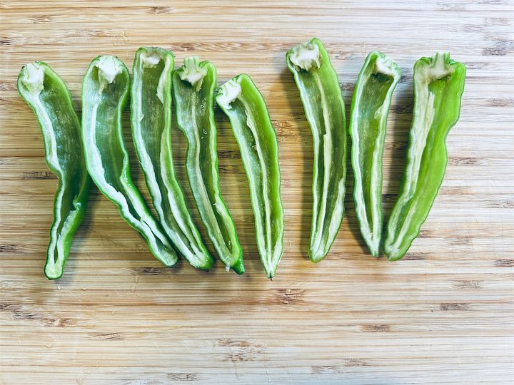 1. 甘長とうがらしのヘタを取り、縦半分に切る。