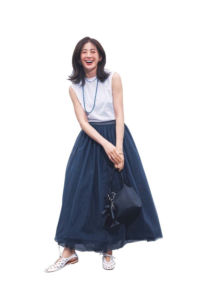 シンプルな白Tを彩る2連のブルーパールネックレス。長めのパールネックレスは、それだけで存在感が漂い、手抜き感が払拭されます。ネイビーのスカートとは、統一感があり、抜群の相性。チェーンのブレスレットは、肌馴染みの良いゴールドで程良いアクセントに。