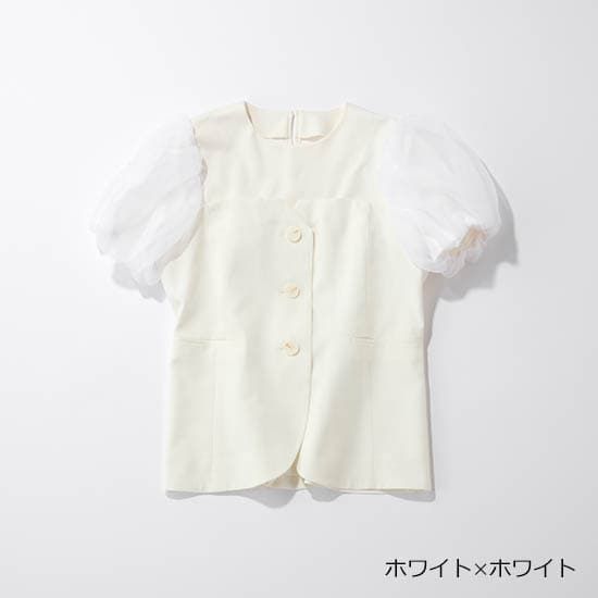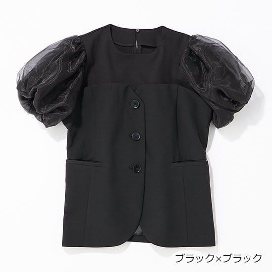 リブ編みと袖のチュールのバランスが絶妙。Vネックを前にするとボタン付きのジレ風に、クルーネックを前にするとすっきりとしたブラウスのように着られます。