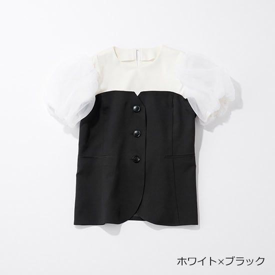 ジャージTシャツ×ビスチェをドッキングさせて、着るだけで今どきのレイヤードが叶う万能トップス。ふんわりチュール袖にしたので、旬の甘ニッシュがこれだけで完成!穴なしバックベルトで楽な位置で留められてサイズ調節も自由自在。