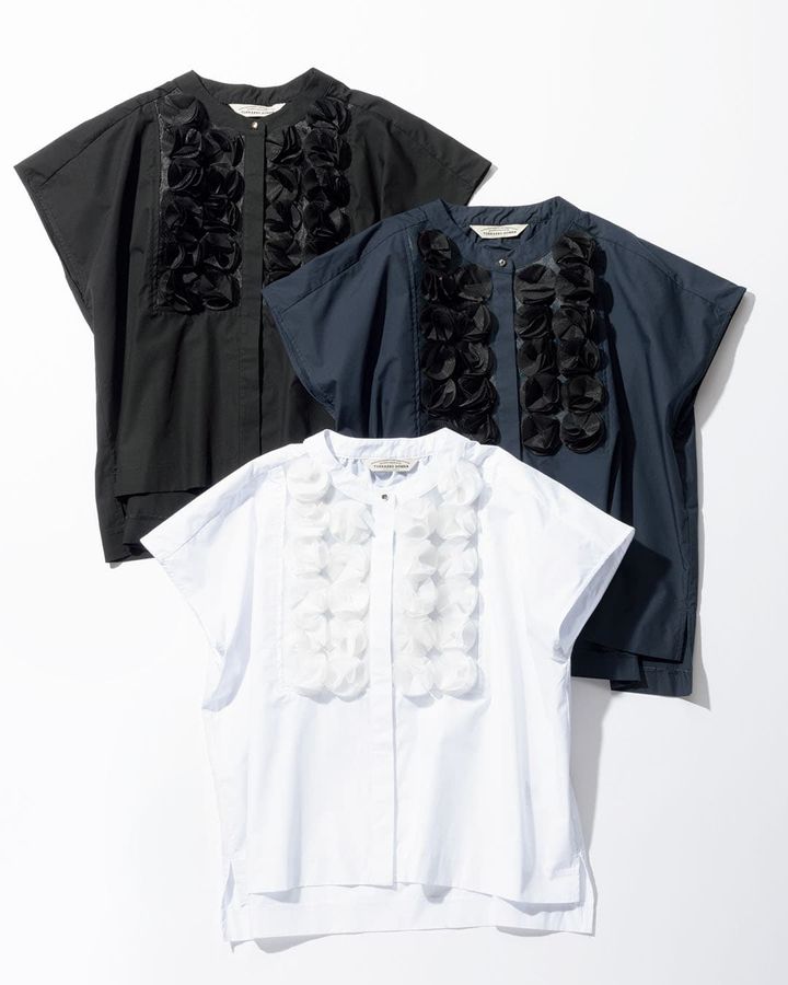 フロントの立体的なお花が上品に華やぐブラウス。気になる二の腕、肩周りはしっかりカバーするフレンチスリーブ。ネイビーがSTORYでしか買えない別注カラー。