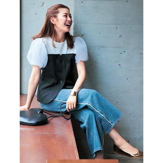 ベスト¥11,900(swanë)タンクトップ¥3,990(アンフィーロ/アンフィーロ〈オンワード樫山〉)スカート¥17,600(アンクレイヴ/アンクレイヴ〈オンワード樫山〉)メガネ¥35,200(ブラン/ライト)ブレスレット¥10,500(クロレココ/ロードス)バッグ/スタイリスト私物