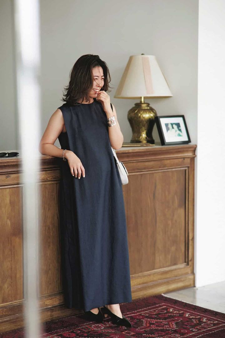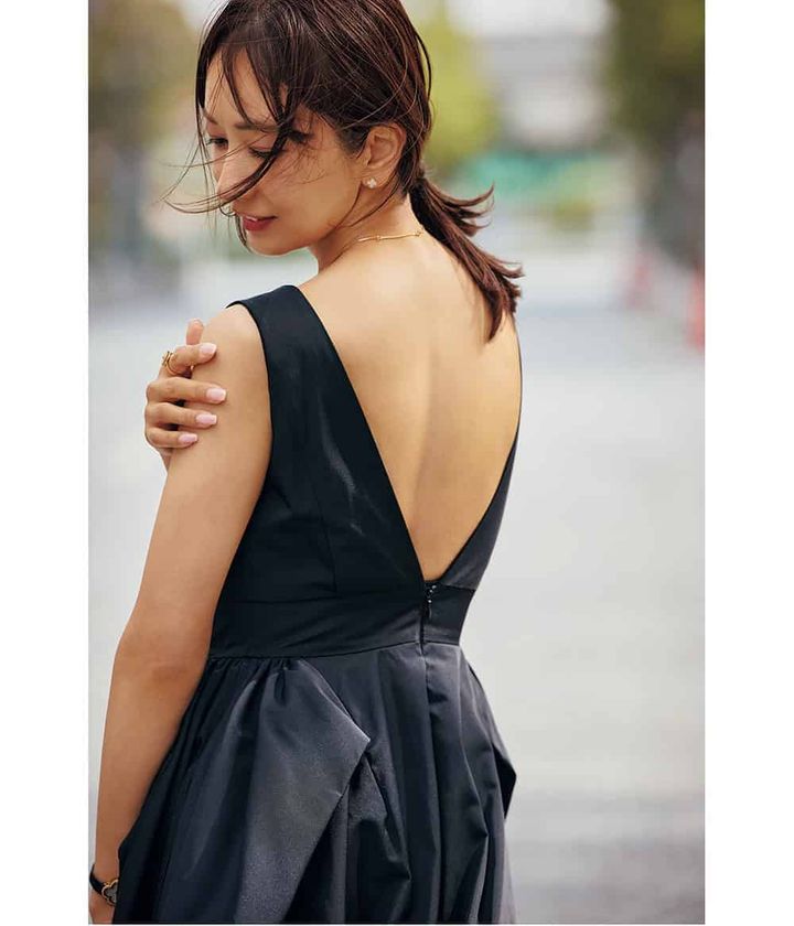 『前から見ると上品で、たっぷりのフレアがエレガントな印象に。後ろから見ると背中が大胆に開いているギャップが新鮮で目を奪われました。ミスコンでドレスをキレイに着るために背中を鍛えたので、今年は背中開きがドラマティックなケイスズキのワンピースに挑戦しました。ここぞという時の一張羅ワンピースは、ホテルでの女子会や夜飲みで大活躍。着ると背筋もピンと伸びて、母でも妻でもない自分を取り戻せる気がして非日常を楽しんでいます』(本誌ライター小泉)