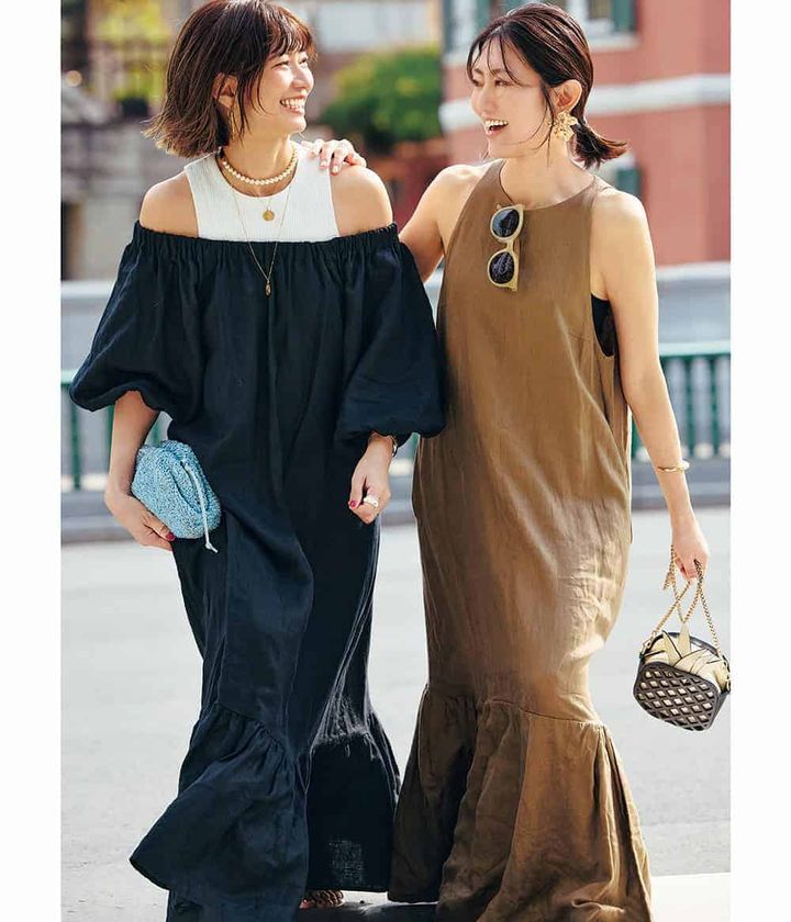 <右>『いかり肩で腕が長いのが自分の強みなので、肩が出るデザインのアメスリが好み。上半身が活かせるワンピースはリネン素材で背中も程よい肌見せができるデザインと、Chaosならではの大人の色味でヘルシー見えを叶えてくれます』(本誌ライター山本)