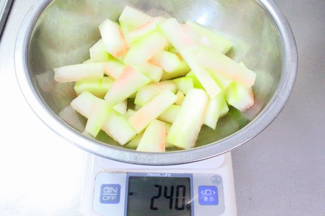 白い皮だけを計量すると240g。今回は皮を340g用意したので、緑色の皮はちょうど100gだったんですね。すいかの皮は捨ててしまいがちですが、約2/3は食べられる部分だったことが判明!