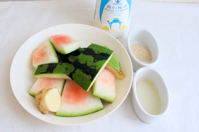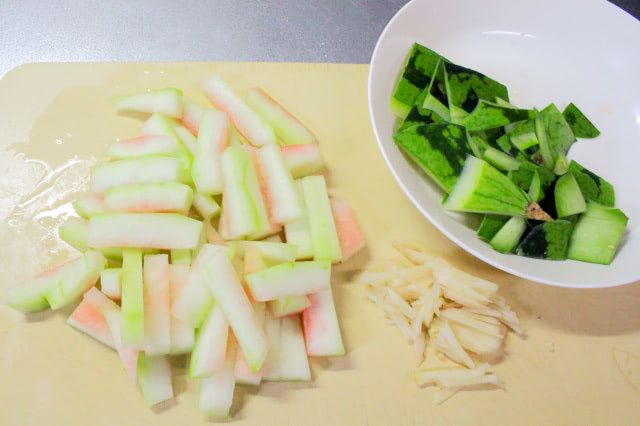 1. すいかの緑の皮を剥いてひと口サイズに切り、しょうがを千切りにします。
