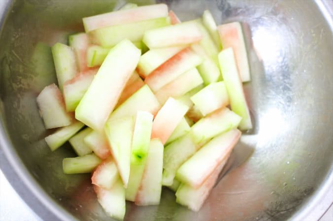 すいかの緑の皮を取り除いて、3cm長さくらいの拍子木切りにしました。