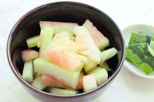 千切りにしたしょうがが、思った以上にピリッとしています。甘酢の味わいと相まって、ガリを食べている気分。すいかの白い皮は瓜そっくりな味わいなので、瓜とガリの和え物風の一品に。