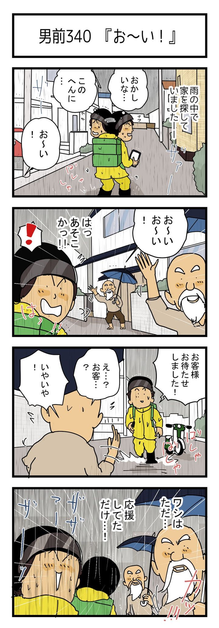 雨が降るなか、配達先の家を一生懸命探していると、突然道路の向こうから「お~いお~い!」と元気に手を振るおじいさんが現れました。配達員さんはてっきり注文したお客様だと思い、慌てておじいさんのもとへ駆け寄ります。しかし、返ってきたのは「ワシはただ…応援してただけ…!」というまさかのひと言。思わず拍子抜けしてしまいますが、雨の中で頑張る姿を見て応援せずにはいられなかったおじいさんの優しさが伝わります。