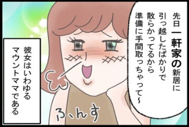 サマ子さんが所属するママ友グループ(プレイグループ)には、いつも個性的な人が集まっています。中でも最近引っ越してきた「マウントママ」さやかさんは、引っ越しや新居について得意げに語り、話の端々で周囲にさりげなく自慢話を挟みます。グループの他のメンバーも、それぞれ自分の生活や家について話す中で、さやかさんのマウント発言にはちょっと困った様子。「また始まった…」と内心で思いながらも、表面上は和やかにやり過ごしています。