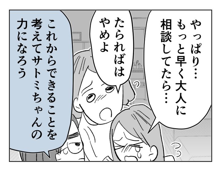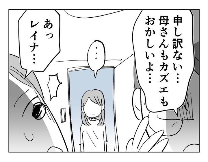ミヅキさんにはレイナちゃんという高校1年生の娘がいます。レイナちゃんは同い年で幼なじみのサトミちゃんと仲良し。別の高校に通っていますが、放課後待ち合わせをして遊んだりしています。そんな中サトミちゃんが手紙を残し家出をする事件が……。そこでサトミちゃんがいじめを受けているとレイナちゃんから知らされます。その後、疎遠だった旦那マサユキさんの妹カズエ・マキ親子が急に訪問。そこでマキちゃんがいじめの犯人ということが発覚。それでもまだ「あいだを取りもってほしい」というカズエさんはしつこく、また義母までもがカズエさんとマキさんの味方をします。マサユキさんは自分の母と妹が異質なものに感じ、怖くなりました。
