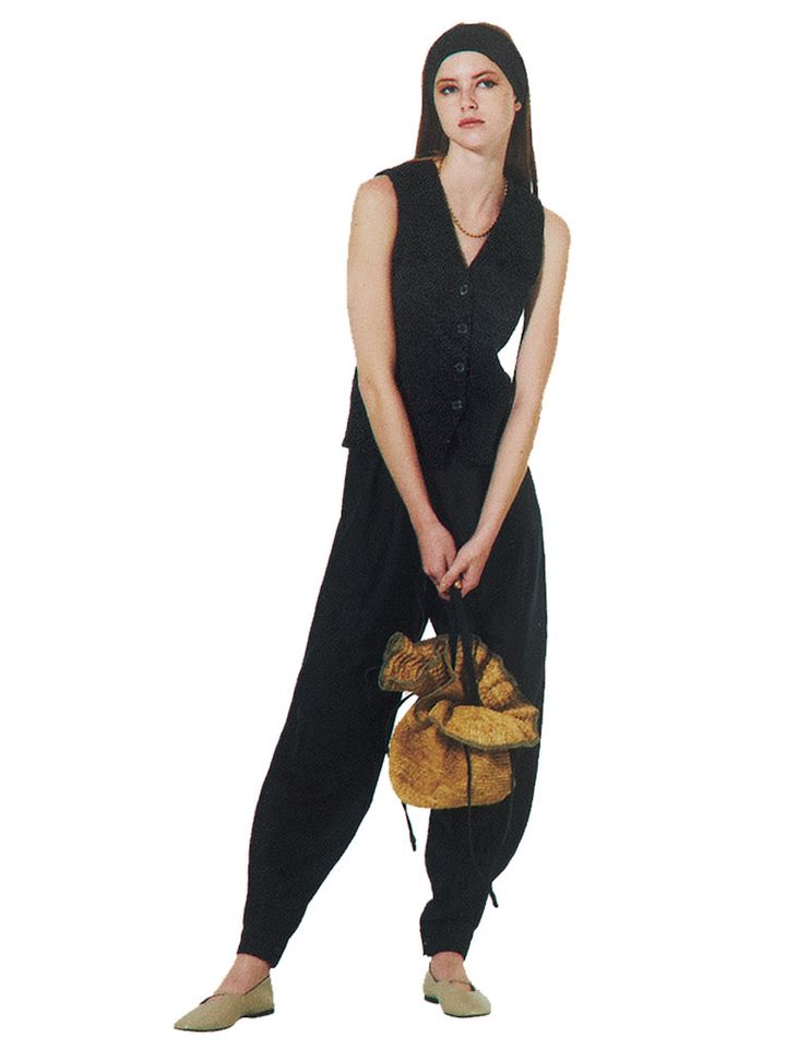 涼しく着られる毛足の短いニット生地の黒ベスト。質感の適度な重みは、リラックスした肌感を大人っぽい隙へ。素材のほっこり感は、硬派な黒と深いVネックでシャープにと、結果気だるくキレイなバランスに着地。ゆとりのある身ごろにジャストな丈感の、どんなボトムも似合うサイジング。