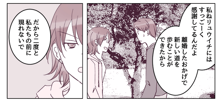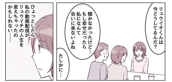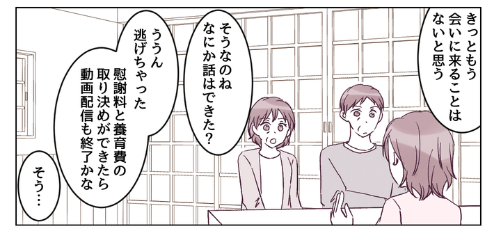 リュウイチには「やり直したい」と泣きつかれましたが、「あなたのおかげで新しい道に進めた」と皮肉を言ってやりました。近いうちに弁護士に相談し、慰謝料と養育費の取り決めができたら動画配信は終了するつもりです。もともと配信を続けたいわけではなかったし、リュウイチへの復讐もそれでおしまいにします。