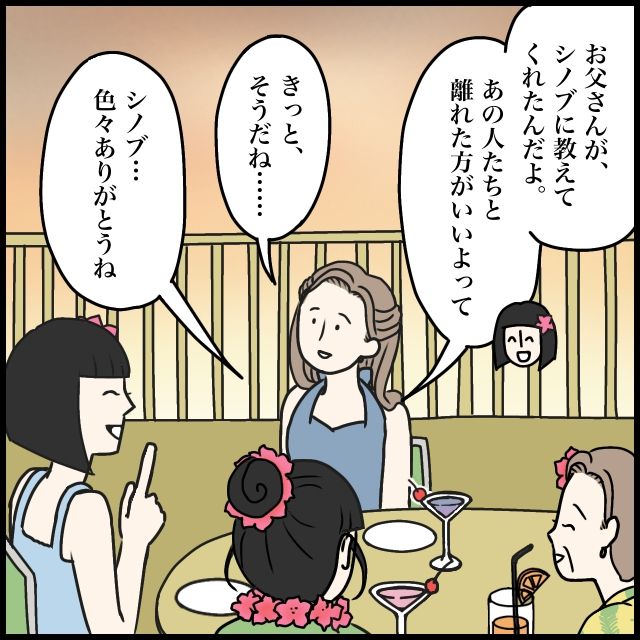 すると、ミホが「お父さんがシノブに教えてくれたんだよ。あの人たちと離れた方がいいよって」と言い、それを聞いて、「きっと、そうだね・・」と呟くと、「シノブ・・色々ありがとうね」お母さんがお礼の言葉を伝えました。