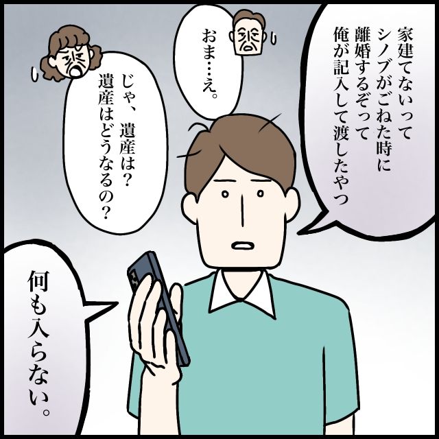 「家建てないってシノブがごねた時に、離婚するぞって俺が記入して渡したやつ」ナオヤが呆然として答えると、「おま・・え」絶句する義父と、「じゃ、遺産は?遺産はどうなるの?」と諦めきれない義母に、「何も入らない」と棒読みで答えるナオヤは、