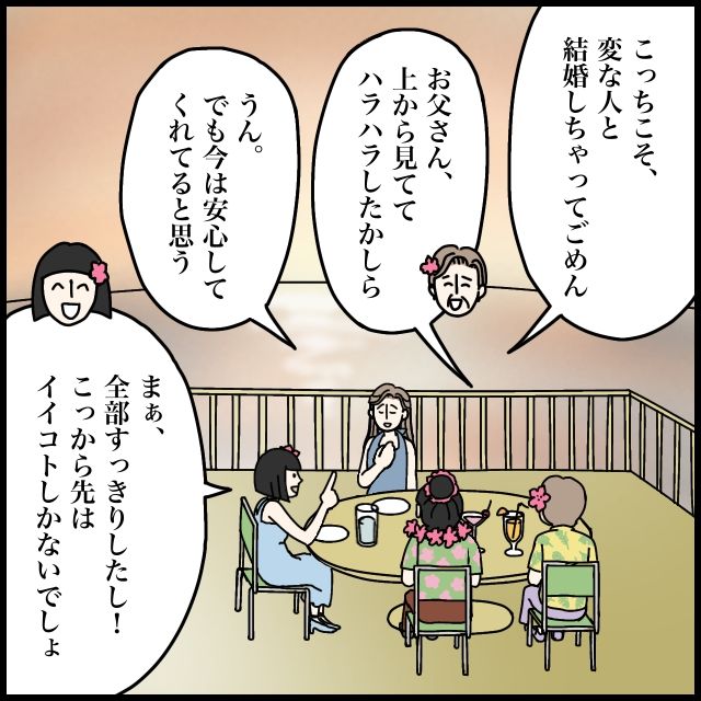 そして、「こっちこそ、変な人と結婚しちゃってごめん」とあやまると、「お父さん、上から見ててハラハラしたかしら」とお母さん。「うん。でも今は安心してくれてると思う」私がそう答えると、「まぁ全部すっきりしたし!こっから先はイイコトしかないでしょ」とミホが笑って言いました。