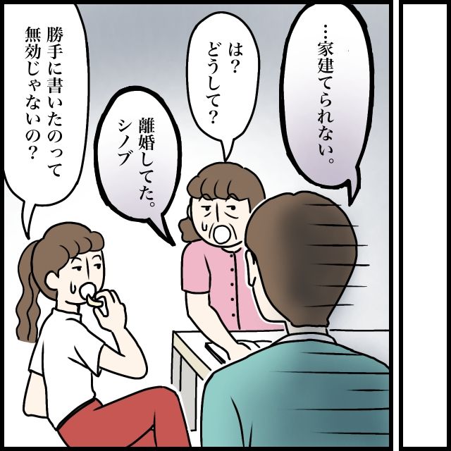 「・・家建てられない」絶望しながらナオヤがそう言うと、「は?どうして?」と驚く義母。「離婚してた。シノブ」呆然と言うナオヤに、「離婚届勝手に書いたのって無効じゃないの?」と義姉も驚いて言いました。